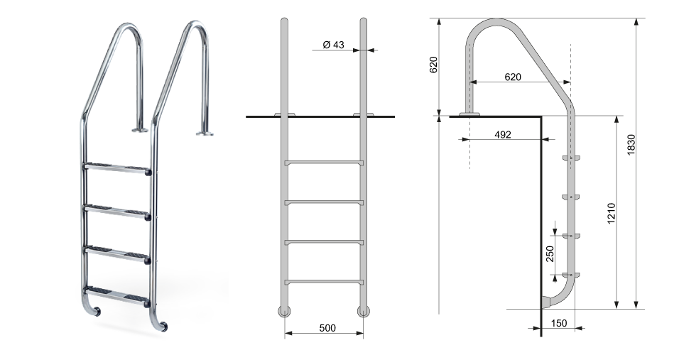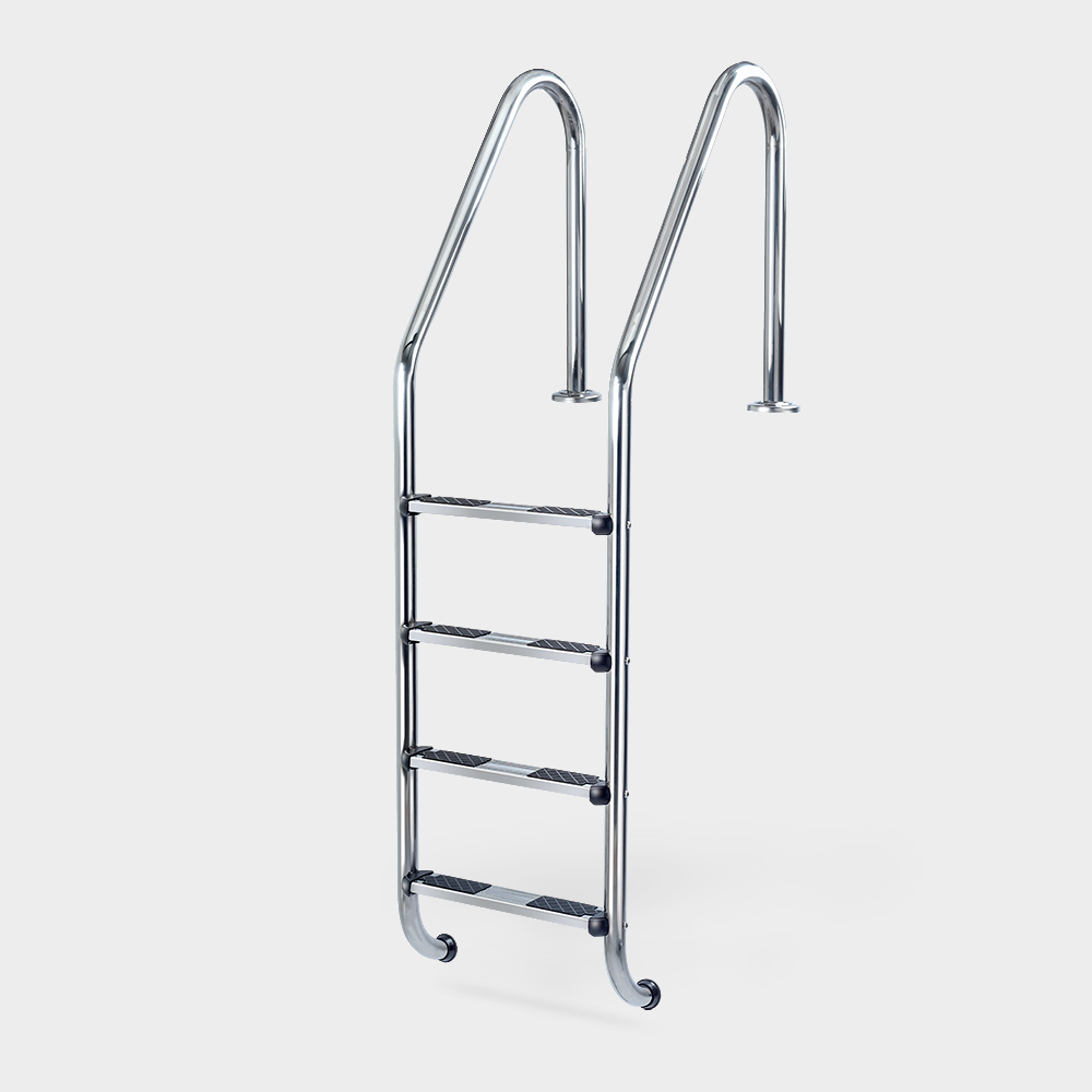 Einhänge-Leiter aus V2A-Edelstahl, weit ausladend und mit 4 Trittstufen, die jeweils über 2 elegante schwarze Kunststoff-Auflagen verfügen. An der Außenseite des Schwimmbads erfolgt die Befestigung der Poolleiter mittels Kunststoff-Einbauhülsen (im Lieferumfang enthalten), welche ebenerdig einzementiert werden und als Aufnahme für die Leiterholme dienen.