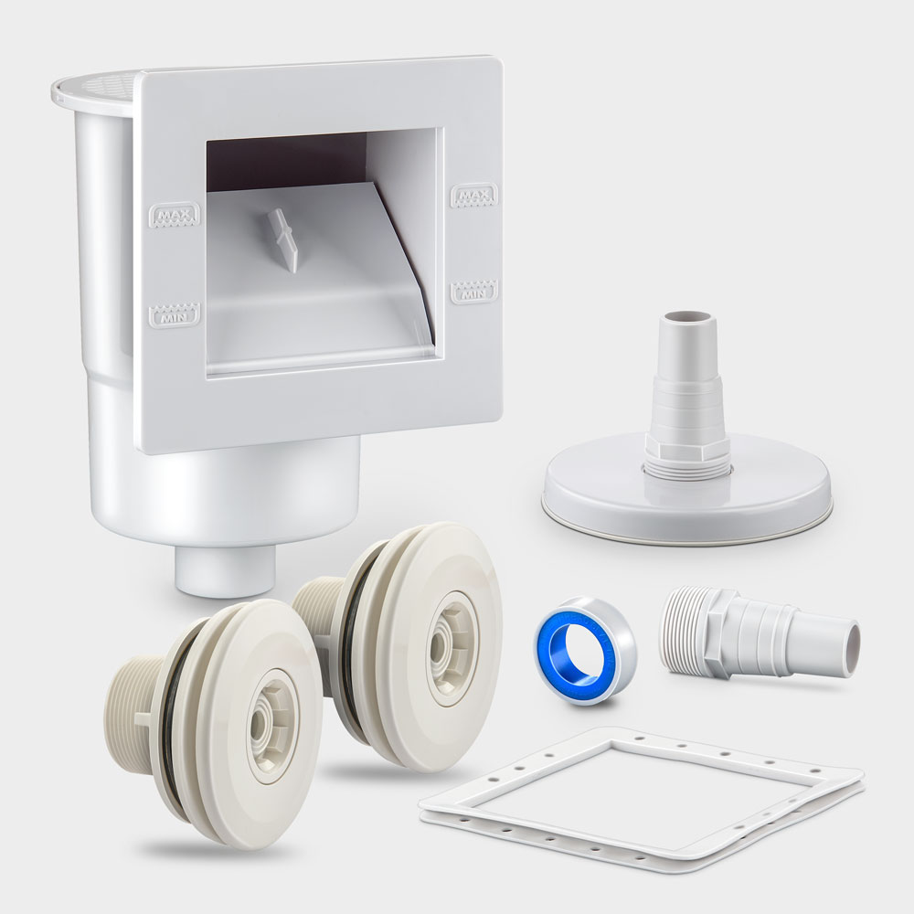 - Einbauskimmer mit 1 1/2" IG Anschluss. Lieferung inkl. Folienflansch, Flanschdichtung, Sicherungs- und Flanschschrauben aus rostfreiem Stahl, Saugplatte für den Anschluss eines Bodenreinigers, Schlauchtülle 1 1/2" AG x 32/38 mm sowie Zierblende zum Verdecken des Flansches.