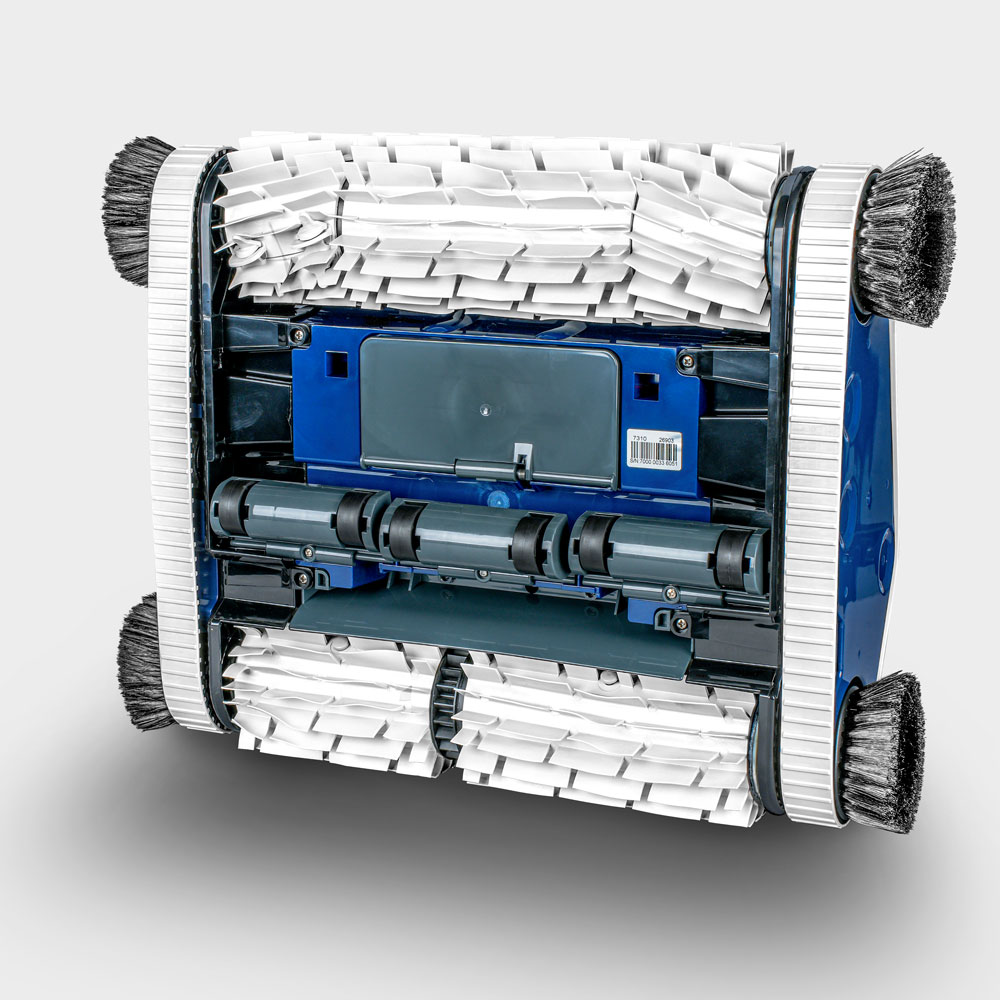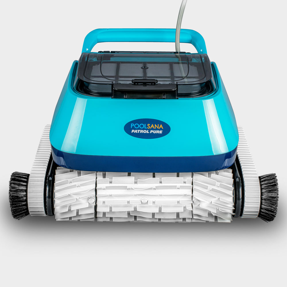 Vorne und hinten sorgen weiche PVC-Bürsten dafür, dass Schmutz effektiv gelöst und zur Einsaugöffnung transportiert wird. Im Sinne eines besonders attraktiven Preis-Leistungs-Verhältnisses verzichtet der Patrol Pure auf zusätzliche PVA-Ringe, die vor allem bei sehr glatten Oberflächen von Vorteil sind. Auf üblichen Pooloberflächen ist jedoch auch ohne diese eine zuverlässige Traktion und gründliche Reinigung gewährleistet. Vier seitlich angebrachte Bürsten unterstützen zusätzlich die Reinigung entlang der Übergänge zwischen Boden und Wand.