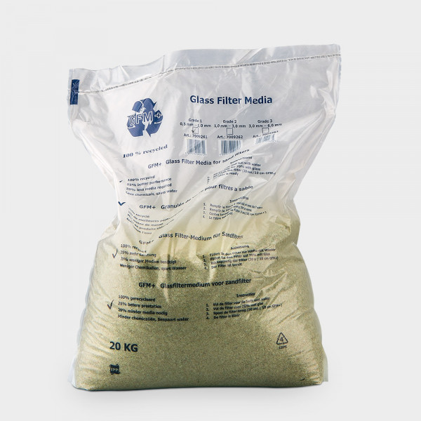 Das Filtermaterial aus recyceltem Glas ist eine hervorragende Alternative zu herkömmlichem Filtersand. Der große Vorteil liegt in der glatten Oberfläche des Filterglases, welche Keim- und Biofilmbildung im Filter verhindert und so für wesentlich bessere Filtrationsergebnisse sorgt. Dadurch ergeben sich kürzere Rückspüldauer, längere Austauschintervalle (3-4 Jahre) und geringerer Wasserpflegemittelverbrauch.