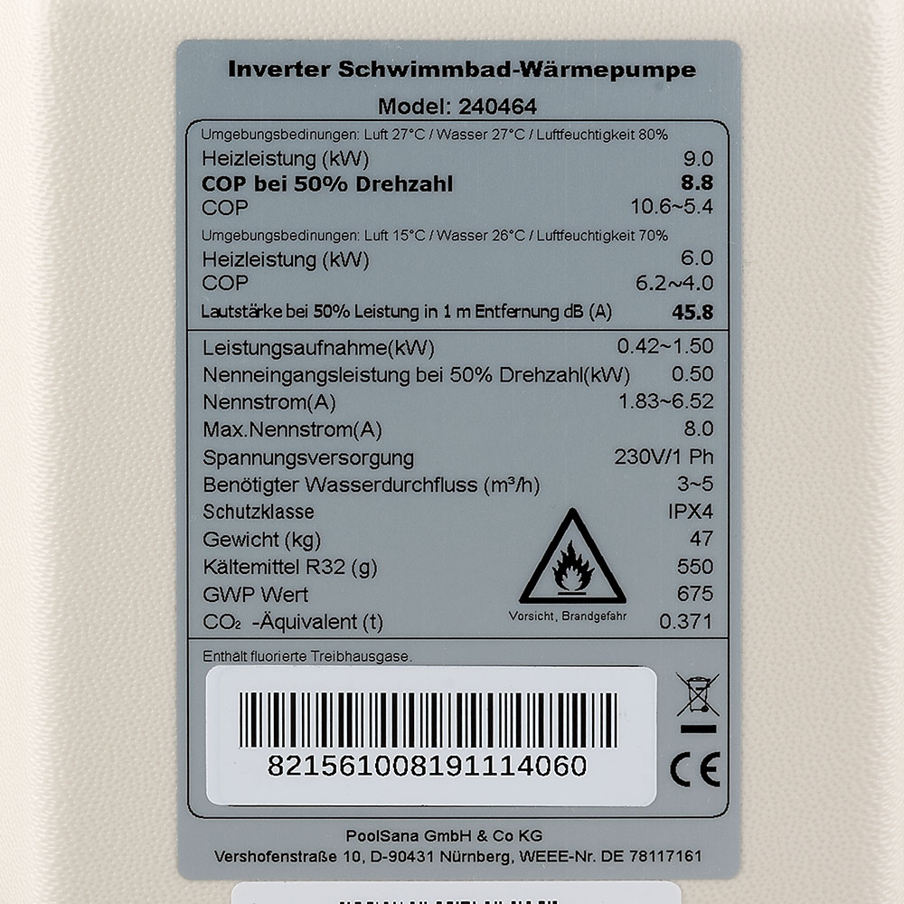 Erforderliche Leistung der Schwimmbadpumpe: Bitte achten Sie darauf, dass die Förderleistung Ihrer Schwimmbadpumpe mindestens den Angaben des „Mindestwasserdurchflusses“ der Wärmepumpe entspricht (zu finden unter dem oben aufgeführten Reiter „Technische Daten“). Falls die Förderleistung deutlich schwächer sein sollte, kann dies insbesondere zu einem weniger effizienten Arbeiten der Wärmepumpe und dadurch zu einem schwächerem Heizergebnis führen. Am besten sollte die Leistung Schwimmbadpumpe zudem ca. 1-2 m³ stärker ausgelegt sein als der erforderliche Mindestwasserdurchfluss.