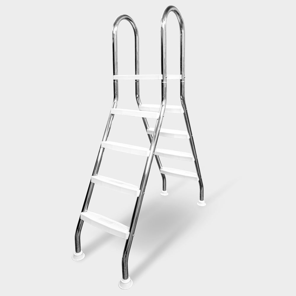 Aufstell-Poolleiter mit Ø 43 mm Leiterholmen aus V2A Edelstahl, innen und außen je 4 Kunststoff-Trittstufen sowie 1 mittigen Plattform.