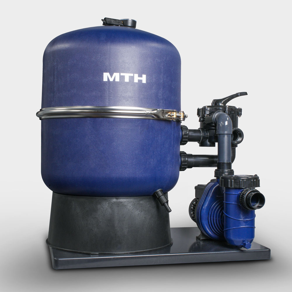 Der in Deutschland hergestellte Filterbehälter überzeugt durch die mittig geteilte Ausführung, wodurch sich die Sandbefüllung bzw. der Sandwechsel besonders einfach gestaltet und die Anlage auch für die Aufstellung in Räumen mit beengten Platzverhältnissen – wie beispielsweise Kellerraum oder Filterschacht – sehr gut geeignet ist. Die Verbindung der zwei Behälterhälften übernimmt ein Edelstahlspannring. Als Material für den Behälter wird GFK (glasfaserverstärkter Kunststoff) verwendet, wodurch die natürliche Reduzierung der Druckbeständigkeit, die zwangsläufig immer mit einer geteilten Ausführung einhergeht, nicht nur egalisiert wird, sondern der Behälter mit bis zu 1,8 bar sogar sehr druckbeständig ist.