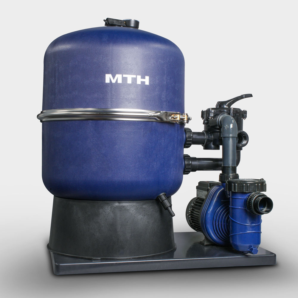 Der in Deutschland hergestellte Filterbehälter überzeugt durch die mittig geteilte Ausführung, wodurch sich die Sandbefüllung bzw. der Sandwechsel besonders einfach gestaltet und die Anlage auch für die Aufstellung in Räumen mit beengten Platzverhältnissen – wie beispielsweise Kellerraum oder Filterschacht – sehr gut geeignet ist. Die Verbindung der zwei Behälterhälften übernimmt ein Edelstahlspannring. Als Material für den Behälter wird GFK (glasfaserverstärkter Kunststoff) verwendet, wodurch die natürliche Reduzierung der Druckbeständigkeit, die zwangsläufig immer mit einer geteilten Ausführung einhergeht, nicht nur egalisiert wird, sondern der Behälter mit bis zu 1,8 bar sogar sehr druckbeständig ist.