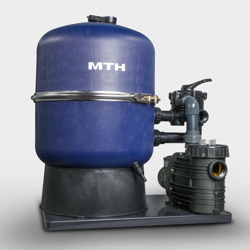 Der in Deutschland hergestellte Filterbehälter überzeugt durch die mittig geteilte Ausführung, wodurch sich die Sandbefüllung bzw. der Sandwechsel besonders einfach gestaltet und die Anlage auch für die Aufstellung in Räumen mit beengten Platzverhältnissen – wie beispielsweise Kellerraum oder Filterschacht – sehr gut geeignet ist. Die Verbindung der zwei Behälterhälften übernimmt ein Edelstahlspannring. Als Material für den Behälter wird GFK (glasfaserverstärkter Kunststoff) verwendet, wodurch die natürliche Reduzierung der Druckbeständigkeit, die zwangsläufig immer mit einer geteilten Ausführung einhergeht, nicht nur egalisiert wird, sondern der Behälter mit bis zu 1,8 bar sogar sehr druckbeständig ist.