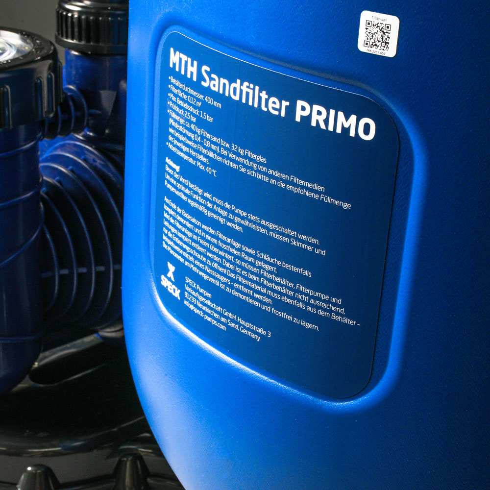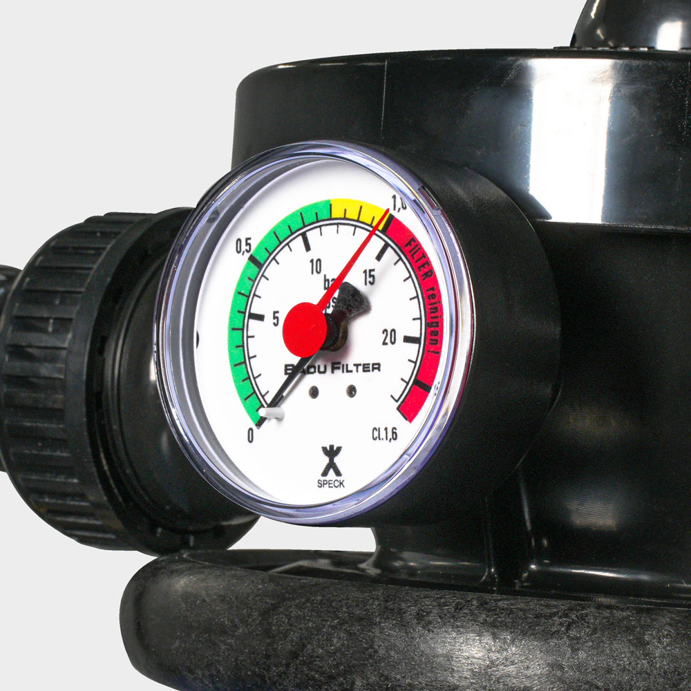 Der starkwandige Sandfilterbehälter von SPECK mit einem Durchmesser von 400 mm wird aus Polypropylen hergestellt und überzeugt u.a. durch eine sehr hochwertige Verarbeitung sowie eine hohe Druckbeständigkeit von bis zu max. 1,5 bar. In Verbindung mit der selbstansaugenden, steckerfertigen Poolpumpe, welche eine Umwälzleistung von ca. 5 m³/h bei 6 mWs (350 Watt / 230 V) hat, ist die SPECK-Filteranlage für Schwimmbecken bis ca. 25 m³ sehr gut geeignet.
