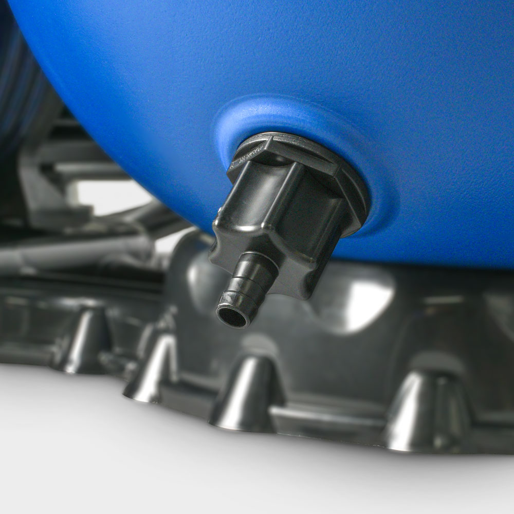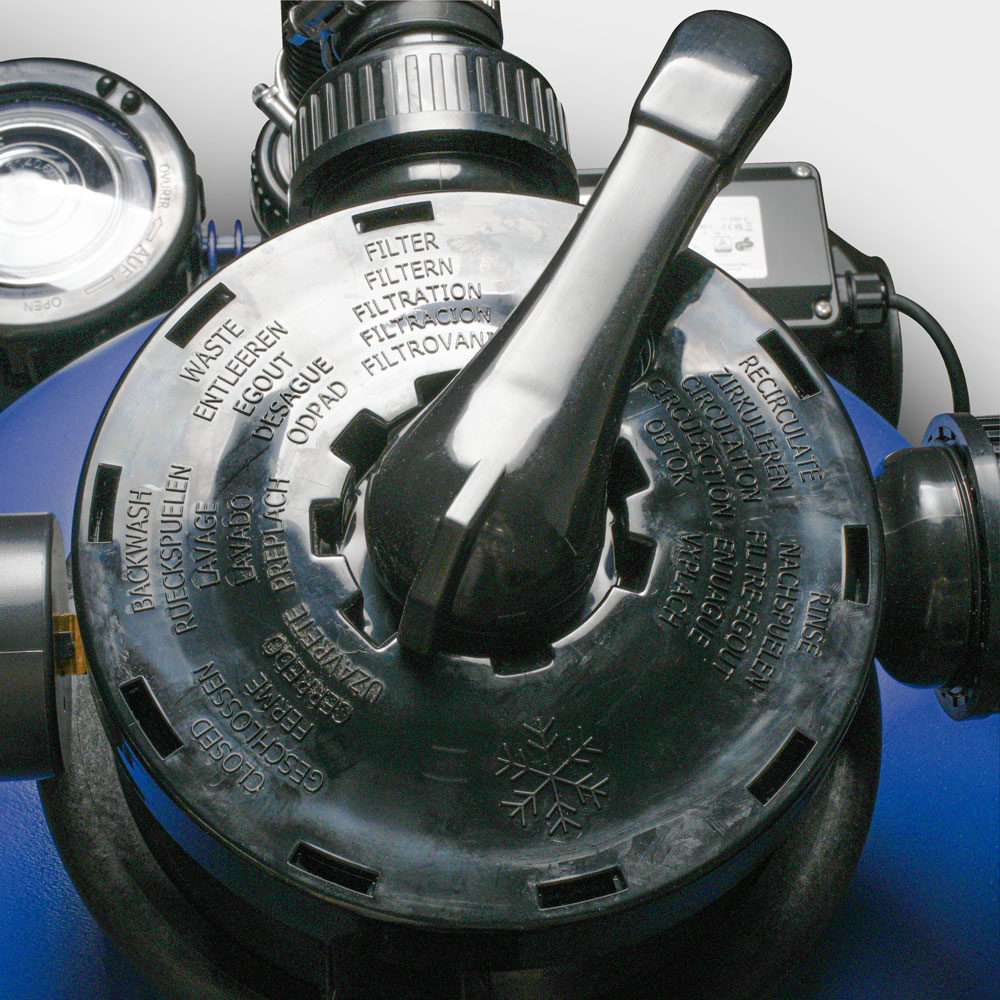 Zum Lieferumfang gehören zudem eine stabile und platzsparende Grundplatte, ein Druckmanometer, ein Kesselentleerungsventil, ein 7-Wege-Rückspülventil, eine Rolle Teflonband sowie ein kürzbarer Spiralschlauch für die Verbindungs zwischen Ventil und Poolpumpe. Für alle 3 Ausgänge des Rückspülventils werden Verschraubungen bzw. Anschlussstücke Ø 32/38 mm sowie Ø 50 mm mitgeliefert.