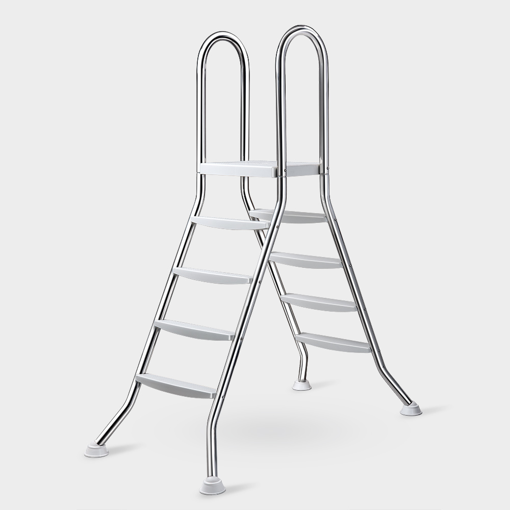 Aufstell-Poolleiter Comfort mit Ø 43 mm Leiterholmen aus V2A Edelstahl, innen und außen je 4 Kunststoff-Trittstufen sowie 1 mittigen Plattform.